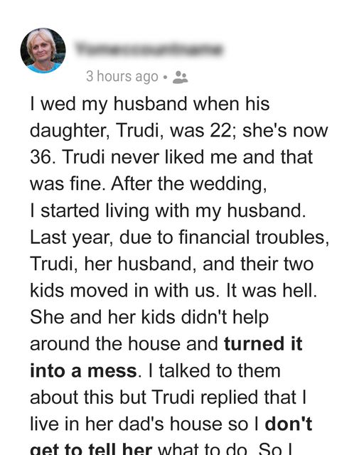 The OP was not willing to live with her stepdaughter and asked her husband to move into the apartment with her, but he is retired and loves living in his home. So the Redditor said the only way she would move back in is if Trudi and her family moved out.