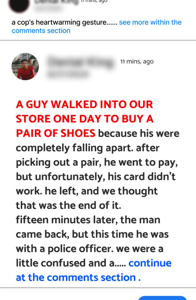 Fifteen minutes later, the man came back, but this time he was with a police officer. We were a little confused and asked, “Is there a problem, officer?” The cop smiled and said, “No, there’s no problem. If you still have the shoes, I’d like to go ahead and buy them.” My coworker and the officer split the cost of the shoes, not for show, but out of genuine kindness. There was no one else in the store, no cameras—just a simple, heartwarming gesture.
