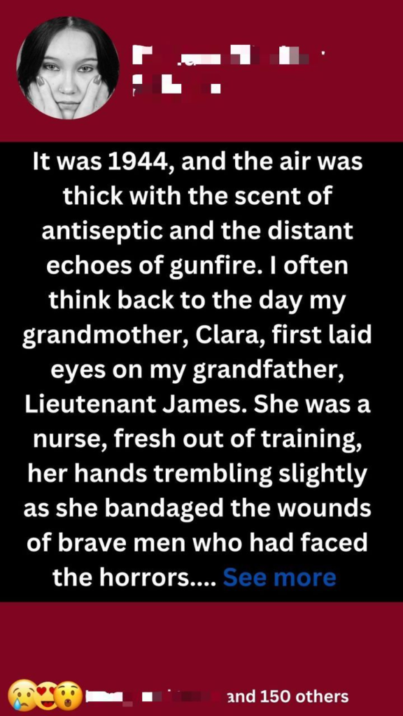 It was 1944, and the air was thick with the scent of antiseptic and the distant echoes of gunfire. I often think back to the day my grandmother, Clara, first laid eyes on my grandfather, Lieutenant James. She was a nurse, fresh out of training, her hands trembling slightly as she bandaged the wounds of brave men who had faced the horrors of war. He was a medic, his uniform stained with the remnants of battle, yet his eyes sparkled with a warmth that could cut through the darkest moments.Their meeting was serendipitous. Clara had just finished her shift when she stumbled into the makeshift break room, desperate for a moment of respite. That’s when she saw him—leaning against the wall, a half-smile playing on his lips as he shared a joke with another soldier. It was as if time stood still. In that chaotic hospital, amidst the cries of the wounded, Clara felt an undeniable pull toward him.As the days turned into weeks, their connection blossomed. They stole moments together between shifts, sharing dreams of a peaceful future. Clara would listen intently as James recounted stories from the front lines, his bravery both inspiring and terrifying. In return, she shared her hopes of returning home to a world free from the shadows of war. They laughed, they cried, and in those fleeting moments, they found a love that felt like a lifeline.
