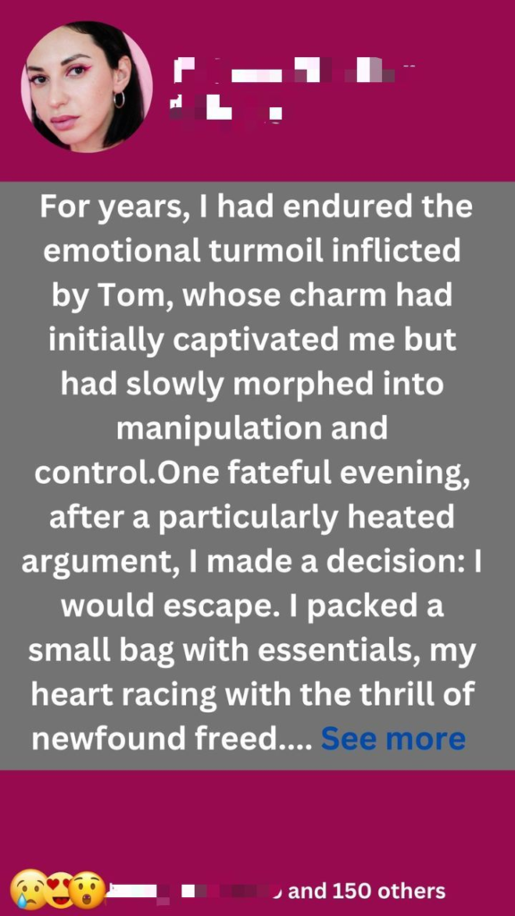 I slipped out of the house under the cover of night, determined to start anew. The city offered a myriad of possibilities, and I felt a flicker of hope igniting within me.As I wandered the bustling streets, I found solace in the anonymity of the crowd. I spent the night in a cozy café, sipping coffee and contemplating my next steps. I had friends in a neighboring town, people who had always supported me, and I resolved to reach out to them. However, as dawn broke, so did my resolve. The fear of Tom’s wrath loomed large in my mind, and I knew he would come looking for me.In my attempt to escape, I inadvertently retraced my steps back to the very source of my problems. I found myself standing outside our shared home, torn between the desire to confront Tom and the instinct to run. The door creaked open, and there he stood, a mixture of anger and concern etched on his face.“Where do you think you’re going?” he demanded, his voice a chilling reminder of the power he wielded over me.In that moment, I realized that true escape wouldn’t come from running away; it would require facing my fears head-on.