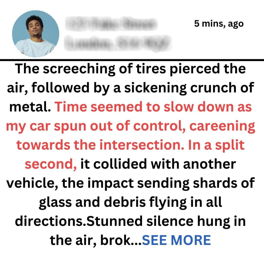 The screeching of tires pierced the air, followed by a sickening crunch of metal. Time seemed to slow down as my car spun out of control, careening towards the intersection. In a split second, it collided with another vehicle, the impact sending shards of glass and debris flying in all directions.Stunned silence hung in the air, broken only by the faint sound of a car alarm blaring in the distance. Slowly, people began to emerge from their homes and shops, drawn by the commotion. They gathered around the scene, their faces etched with shock and concern.