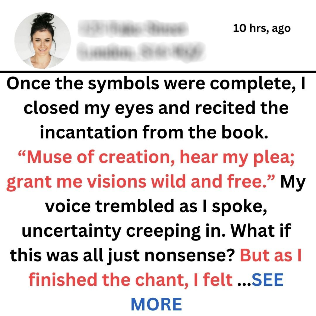 Once the symbols were complete, I closed my eyes and recited the incantation from the book. “Muse of creation, hear my plea; grant me visions wild and free.” My voice trembled as I spoke, uncertainty creeping in. What if this was all just nonsense? But as I finished the chant, I felt a sudden rush of energy fill the room.The candle flickered violently, casting erratic shadows that danced across the walls. My heart raced as I opened my eyes. The air felt charged with possibility. Grabbing my paintbrush, I began to move instinctively, colors swirling on the canvas before me.