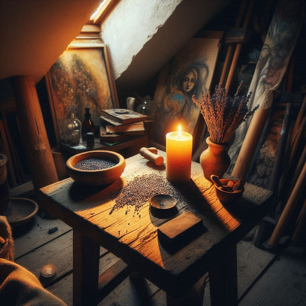 In the dim light of my cluttered attic, I prepared for what I hoped would be a transformative evening. For weeks, I had struggled to break through my creative block, staring at blank canvases and empty pages. Frustrated and desperate, I turned to an ancient book of rituals I had discovered in my grandmother’s old trunk. The pages were yellowed and fragile, filled with strange symbols and arcane instructions.I carefully laid out my supplies: a small wooden table, a flickering candle, a bowl of water, a handful of dried lavender, and a piece of charcoal. Following the instructions meticulously, I lit the candle first and placed it at the center of the table. The flame danced in the stillness, casting shadows that seemed to whisper secrets.Next, I sprinkled the lavender around the candle in a perfect circle, its calming scent filling the air. I dipped my fingers into the bowl of water, letting the coolness awaken my senses. With a deep breath, I picked up the piece of charcoal and began to draw symbols on a piece of parchment—spirals, stars, and waves—each representing creativity and inspiration.