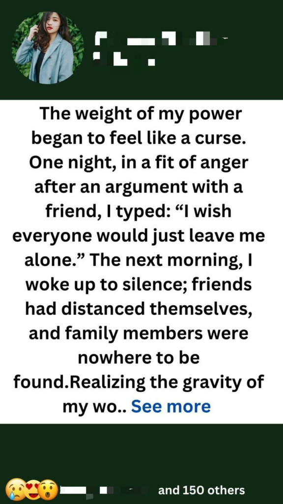 One evening, in a moment of frustration after a long day at work, I typed: “I wish my boss would quit.” The next day, I received an email announcing that my boss had resigned. A mix of guilt and relief washed over me. Was it really that easy? Could I manipulate my life with mere words?As days turned into weeks, my writing became more ambitious. I crafted elaborate scenarios—wealth, fame, love—but each time I manifested something significant, unintended consequences followed. A new job came with demanding hours and toxic coworkers; a whirlwind romance ended in heartbreak when jealousy brewed from my partner’s insecurities.The weight of my power began to feel like a curse. One night, in a fit of anger after an argument with a friend, I typed: “I wish everyone would just leave me alone.” The next morning, I woke up to silence; friends had distanced themselves, and family members were nowhere to be found.Realizing the gravity of my words, I understood that every sentence carried immense power. From that moment on, I decided to use my gift wisely. Instead of crafting selfish desires or fleeting whims, I began writing affirmations and positive intentions—hoping to create a life filled with love and connection rather than isolation and regret.