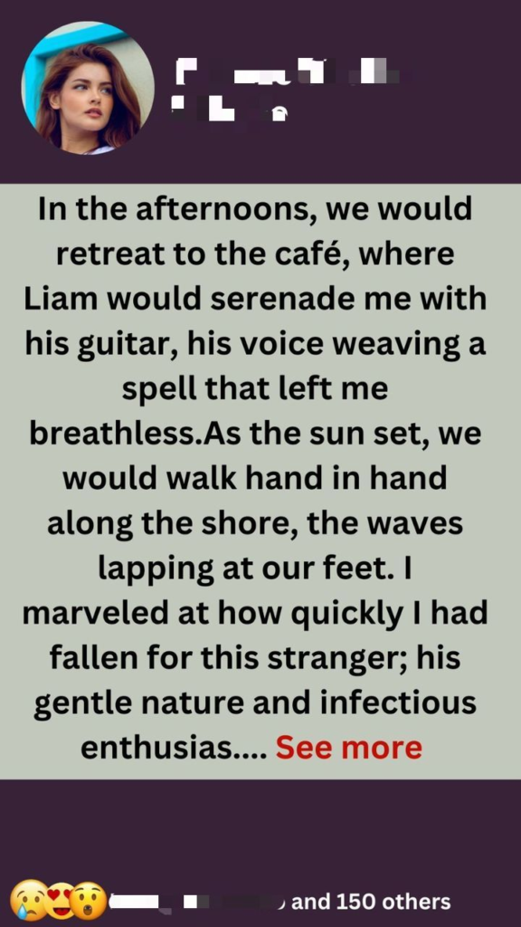 Gathering my courage, I approached him and introduced myself. The man, whose name was Liam, greeted me with a warm smile and an easy charm that instantly put me at ease. We struck up a conversation, discovering our shared love for music and adventure.Over the next few days, Liam and I became inseparable. We spent our mornings exploring the quaint seaside town, visiting local shops and hidden beaches. In the afternoons, we would retreat to the café, where Liam would serenade me with his guitar, his voice weaving a spell that left me breathless.As the sun set, we would walk hand in hand along the shore, the waves lapping at our feet. I marveled at how quickly I had fallen for this stranger; his gentle nature and infectious enthusiasm captured my heart.But as the summer days began to dwindle, the reality of our situation dawned on us. Liam was only visiting for the summer, and I lived miles away in the city. The thought of saying goodbye filled us both with a bittersweet ache.
