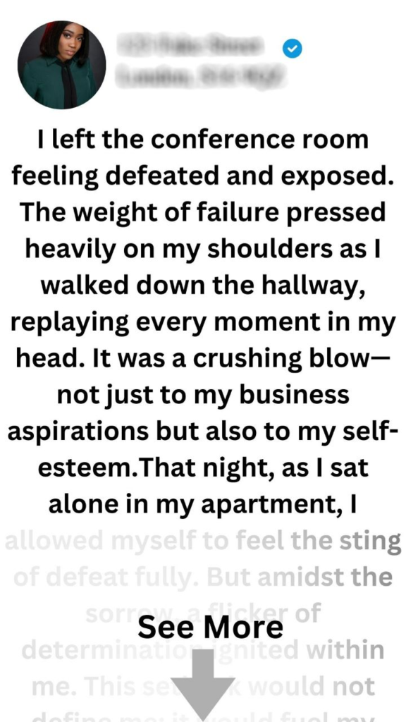 As the presentation came to an end, I could sense the disappointment in the room. The head investor leaned forward and said, “Thank you for your time, but we don’t believe this is the right investment for us.” The words echoed in my mind like a death knell.I left the conference room feeling defeated and exposed. The weight of failure pressed heavily on my shoulders as I walked down the hallway, replaying every moment in my head. It was a crushing blow—not just to my business aspirations but also to my self-esteem.That night, as I sat alone in my apartment, I allowed myself to feel the sting of defeat fully. But amidst the sorrow, a flicker of determination ignited within me.