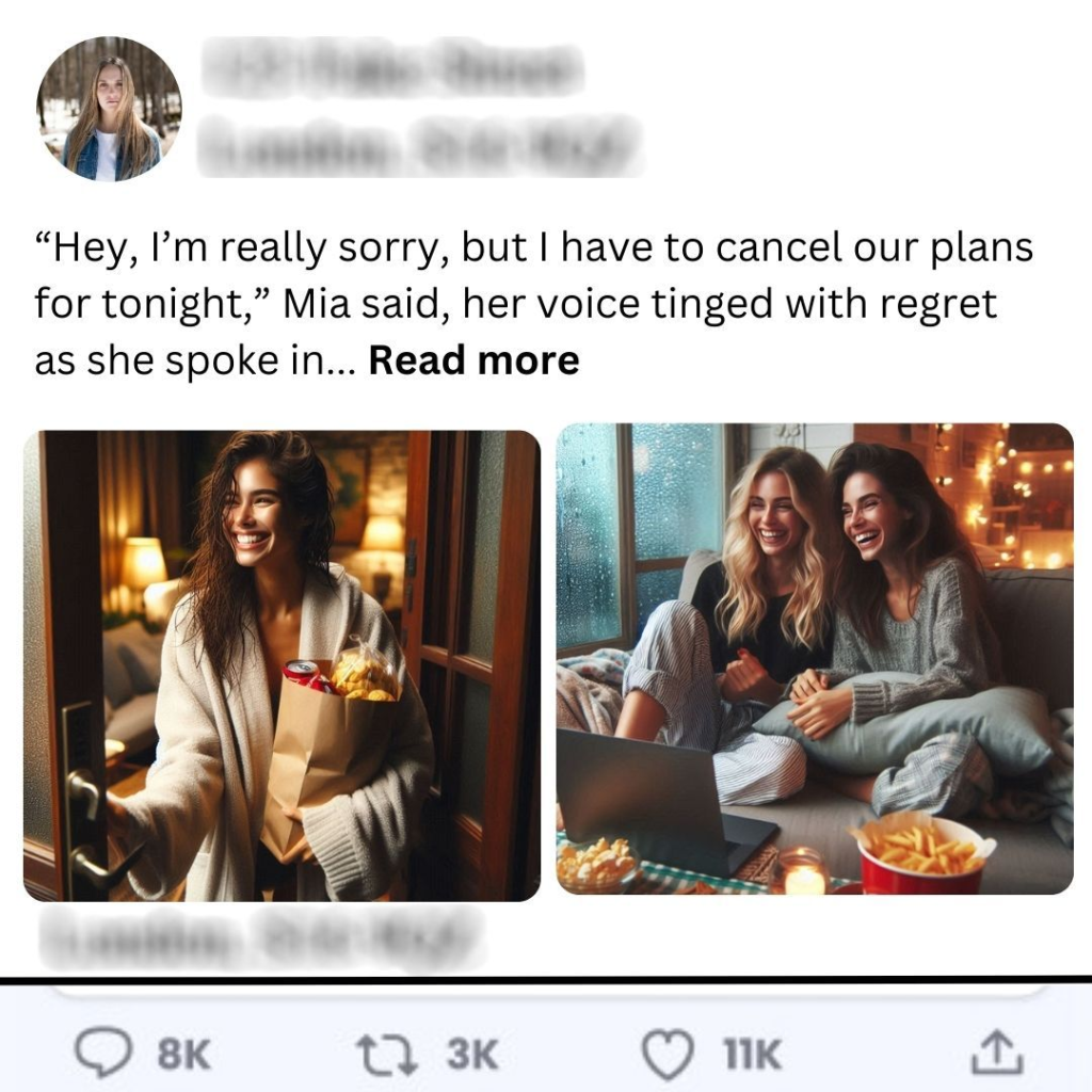 “Hey, I’m really sorry, but I have to cancel our plans for tonight,” Mia said, her voice tinged with regret as she spoke into her phone. She could almost hear the disappointment on her best friend Lily’s end of the line.“What? Mia, we’ve been looking forward to this for weeks! Is everything okay?” Lily replied, concern evident in her tone.Mia glanced out the window at the rain pouring down in sheets. The gloomy weather mirrored her mood. “I just… I don’t feel up to it. I’ve had a long week, and I think I need some time to recharge.”Lily sighed. “I get it. Just don’t forget that you promised to take care of yourself. But I’ll miss you tonight!”After hanging up, Mia sank into the plush couch, wrapping herself in a soft blanket. She felt guilty for canceling but knew she needed this time alone. The past few weeks had been overwhelming—work had been stressful, and she felt like she was constantly juggling responsibilities without a moment to breathe.As she settled in with a cup of herbal tea, she opened her journal and began to write. Words flowed onto the page as she poured out her thoughts and feelings. It felt cathartic to release everything that had been weighing on her mind.Suddenly, there was a knock at the door. Startled, Mia set down her pen and walked over cautiously. When she opened it, she was surprised to find Lily standing there, drenched from the rain but grinning widely.