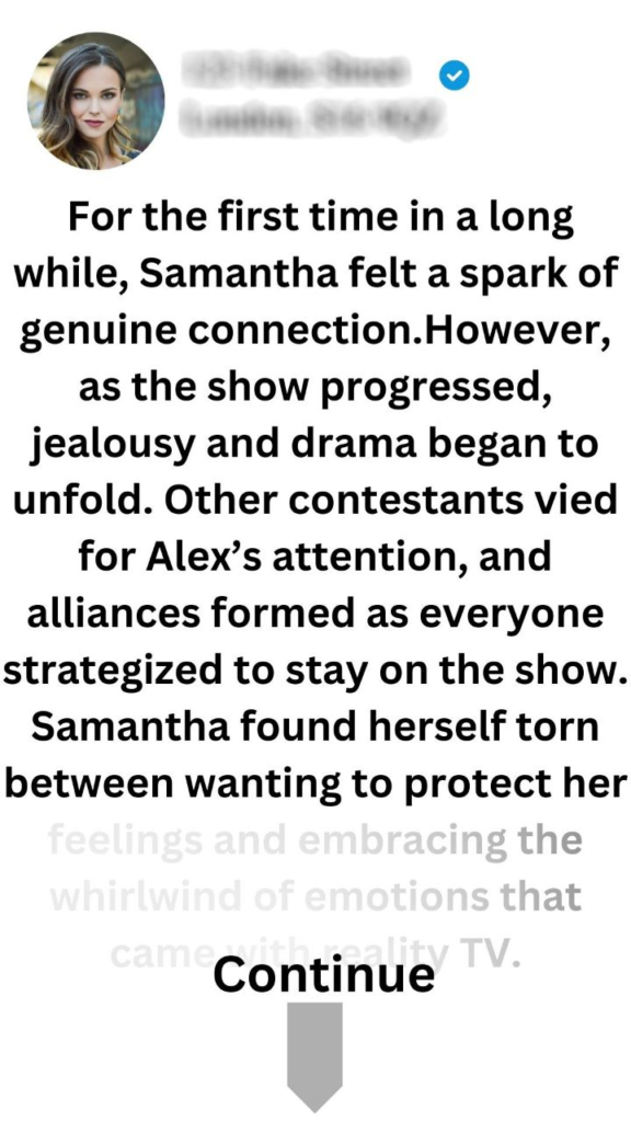 However, as the show progressed, jealousy and drama began to unfold. Other contestants vied for Alex’s attention, and alliances formed as everyone strategized to stay on the show. Samantha found herself torn between wanting to protect her feelings and embracing the whirlwind of emotions that came with reality TV.One evening, during a dramatic rose ceremony, Samantha realized that love was not just about chemistry; it was also about vulnerability and trust. As she stood before Alex, surrounded by cameras and bright lights, she took a deep breath and confessed her feelings.“Even in this crazy environment, I feel something real with you,” she said, her voice steady but filled with emotion.