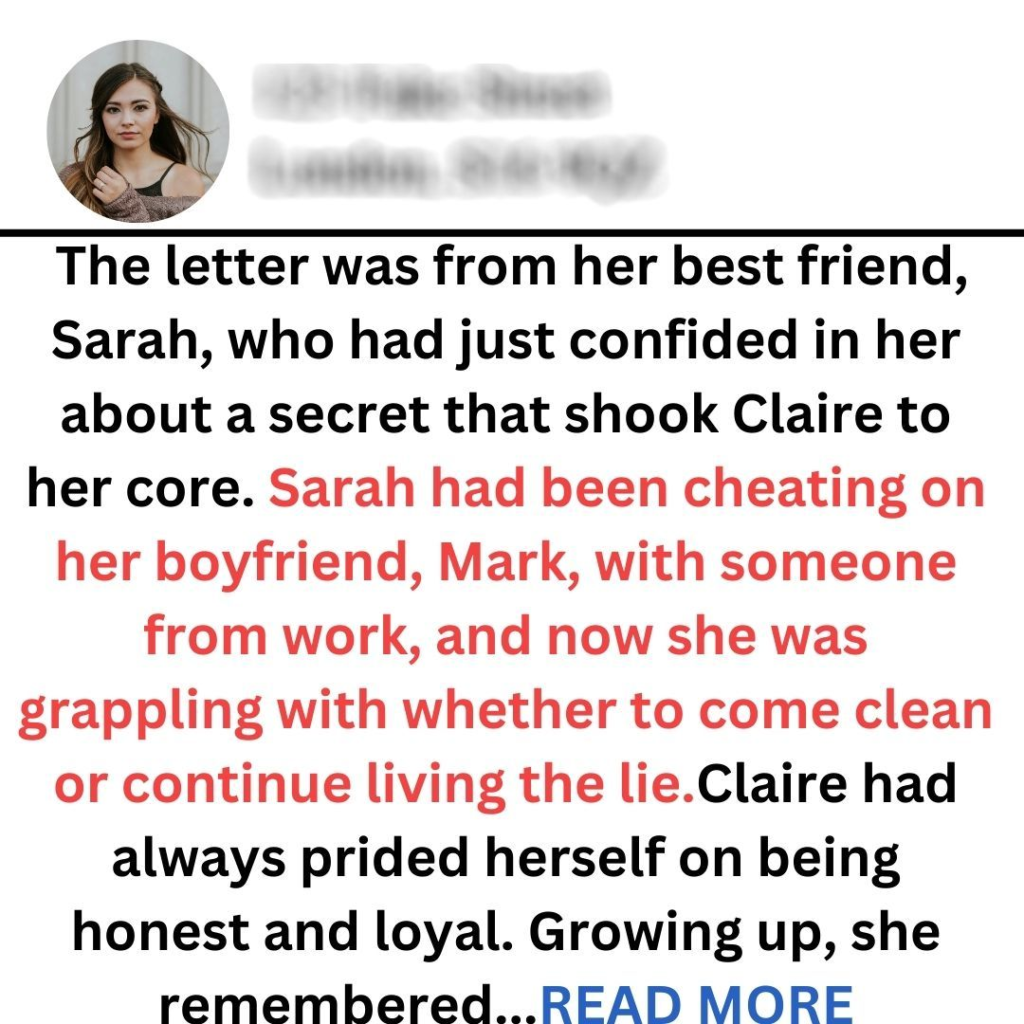 Claire sat on the edge of her bed, staring at the crumpled letter in her hands. It was a simple piece of paper, but it felt like a boulder pressing down on her chest. The letter was from her best friend, Sarah, who had just confided in her about a secret that shook Claire to her core. Sarah had been cheating on her boyfriend, Mark, with someone from work, and now she was grappling with whether to come clean or continue living the lie.Claire had always prided herself on being honest and loyal. Growing up, she remembered a time when she had been faced with a similar dilemma involving her younger brother, Jake. He had stolen money from their parents’ wallet to buy video games, and when Claire discovered it, she was torn between protecting him and doing the right thing. Ultimately, she chose to tell their parents, believing it was important for Jake to learn accountability. But now, faced with Sarah’s betrayal, Claire felt the weight of that past decision pressing down on her.