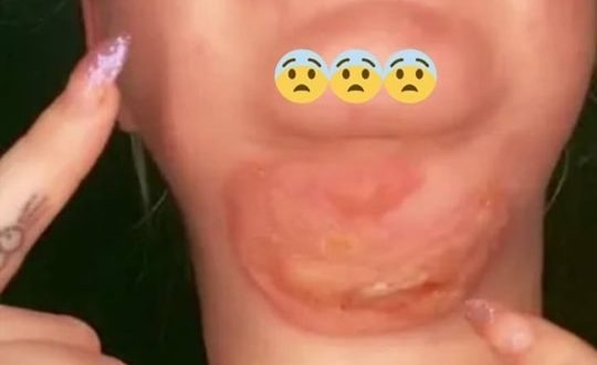 . However, her video now serves as a cautionary tale. She explains that instead of achieving her desired results, she was left with severe burns and blisters under her chin, accompanied by significant swelling that even affected her vocal cords.