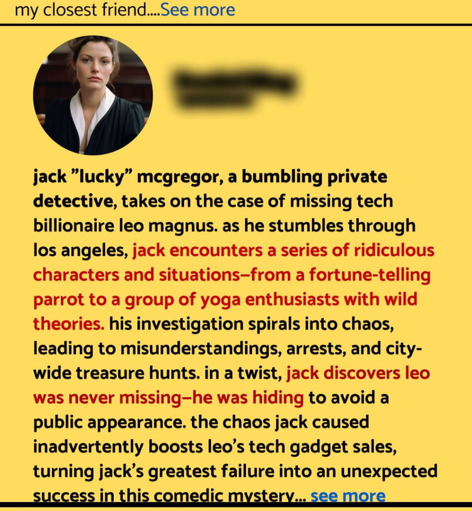 Jack “Lucky” McGregor was not your average private detective. Known more for his clumsiness than his detective skills, he had a knack for finding himself in the most ridiculous situations. When he was hired to find the missing tech billionaire, Leo Magnus, Jack thought this was finally his big break. With nothing but a cryptic note and a trail of bizarre clues, Jack set off across Los Angeles. But as the investigation unfolded, Jack stumbled into a world of eccentric characters, including a fortune-telling parrot, a conspiracy theorist cab driver, and a group of yoga enthusiasts convinced that Leo had ascended to a higher plane of existence.
