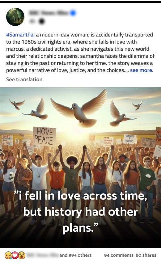 Samantha was an ordinary woman, living an ordinary life, until she stumbled upon an antique watch at a flea market. The intricate design caught her eye, and without hesitation, she bought it. But when she tinkered with it later that evening, the watch emitted a strange glow, and in a dizzying whirl, she found herself standing in the middle of a bustling street—except it wasn’t the present day. It was the 1960s, a time of civil rights marches, social upheaval, and a nation on the brink of change. Confused and scared, Samantha tried to blend in, but fate had other plans. She soon met Marcus, a passionate civil rights activist whose determination to fight for justice drew her in.