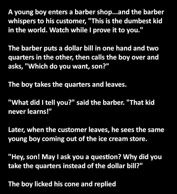 To illustrate his point, the barber places a dollar bill in one hand and two quarters in the other. He then calls the boy over and asks, “Which do you want, son?”