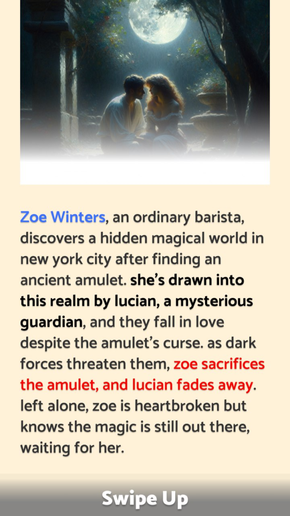 In a climactic battle beneath the city streets, Zoe makes the ultimate sacrifice to save Lucian, shattering the amulet and breaking its curse. But as the magic dissipates, so does Lucian, fading into the shadows, leaving Zoe alone in a world that suddenly feels all too ordinary. Heartbroken yet empowered, Zoe returns to her normal life, but with a secret knowledge that the magic isn’t truly gone—it’s just waiting for her to find it again.