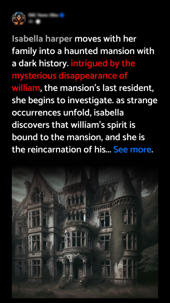 Isabella Harper, a young woman with a passion for history, moves with her family into an old, abandoned mansion nestled deep in the woods. The mansion, once owned by a wealthy family, is rumored to be haunted. Despite the ominous warnings from the locals, Isabella is intrigued by the mansion’s dark history and begins to explore its dusty rooms and hidden corridors. Her curiosity leads her to discover a portrait of a handsome man, William, who was the mansion’s last resident before his mysterious disappearance.