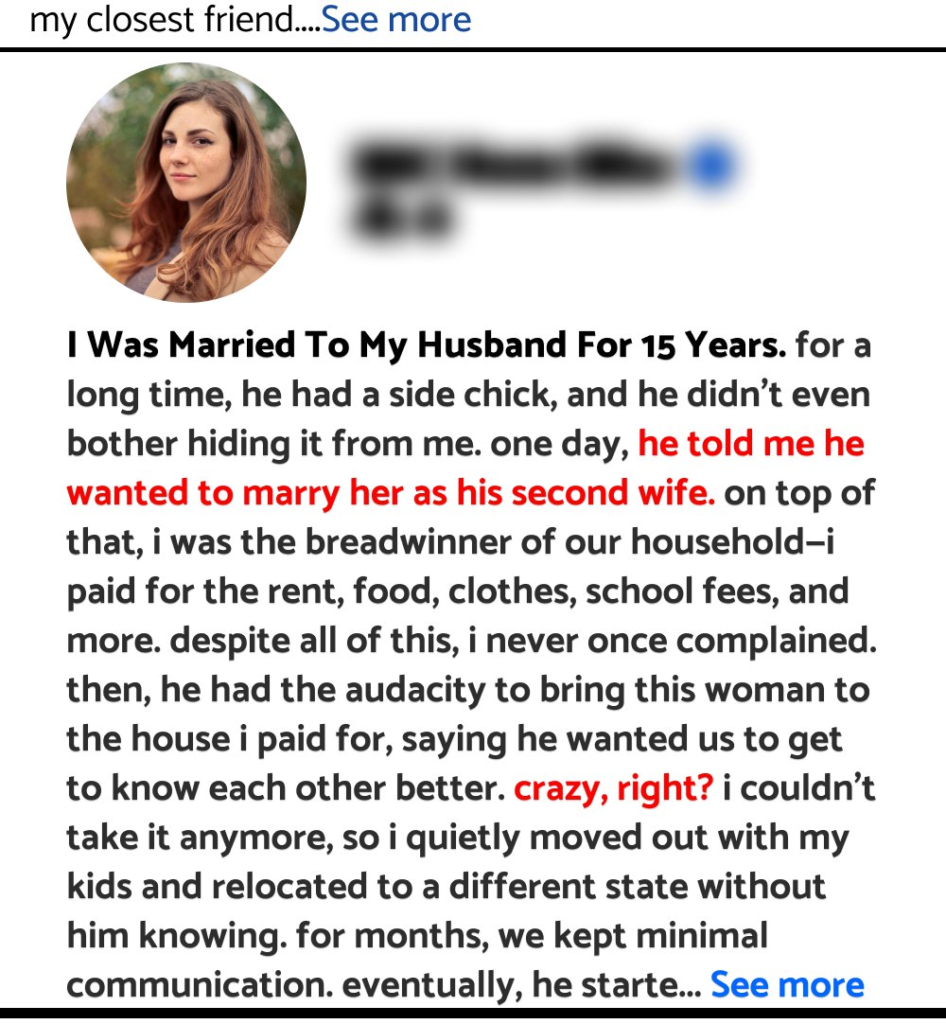 I was married to my husband for 15 years. For a long time, he had a side chick, and he didn’t even bother hiding it from me. One day, he told me he wanted to marry her as his second wife. On top of that, I was the breadwinner of our household—I paid for the rent, food, clothes, school fees, and more. Despite all of this, I never once complained. Then, he had the audacity to bring this woman to the house I paid for, saying he wanted us to get to know each other better. Crazy, right?