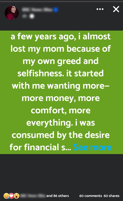 A few years ago, I almost lost my mom because of my own greed and selfishness. It started with me wanting more—more money, more comfort, more everything. I was consumed by the desire for financial success and material wealth, pushing aside everything else, including my family. My mom was always there for me, supporting my ambitions and dreams. Yet, I was so wrapped up in my pursuit that I didn’t see how my actions were impacting her. One day, in my relentless drive to achieve more, I made a risky investment. It was a venture that promised high returns but came with significant risk. I convinced my mom to invest her savings, promising her that it would secure our future. She trusted me and put in a substantial amount of money, despite her own reservations. When the investment failed miserably, it wasn’t just the financial loss that hit us—it was the emotional fallout. My mom, who had always been my rock, was devastated. She had sacrificed so much for me, and I had turned her trust into a catastrophe. Watching her suffer because of my decisions was unbearable. I felt immense guilt and shame for what I had done. The realization that my greed had nearly cost me the most important person in my life was a crushing blow. It took a long time for us to recover from the financial loss, but the emotional damage was even more profound. I had to face the harsh truth about my actions and make amends. The experience taught me a valuable lesson about the dangers of letting greed control your life. Now, I cherish every moment with my mom and am determined to never let ambition overshadow the people I love.