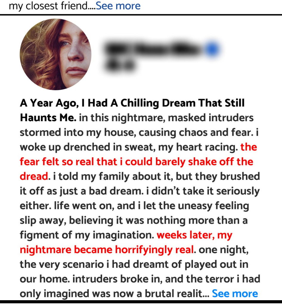 A year ago, I had a chilling dream that still haunts me. In this nightmare, masked intruders stormed into my house, causing chaos and fear. I woke up drenched in sweat, my heart racing. The fear felt so real that I could barely shake off the dread. I told my family about it, but they brushed it off as just a bad dream. I didn’t take it seriously either. Life went on, and I let the uneasy feeling slip away, believing it was nothing more than a figment of my imagination.