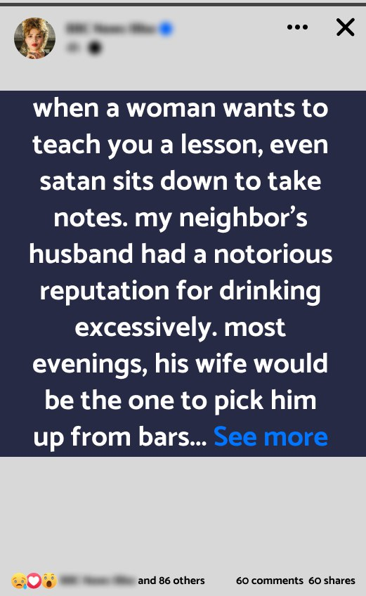 When a woman wants to teach you a lesson, even Satan sits down to take notes. My neighbor’s husband had a notorious reputation for drinking excessively. Most evenings, his wife would be the one to pick him up from bars and terraces. Exhausted from the constant cycle, she reached a breaking point. Last Monday, she decided it was time to make a drastic change.