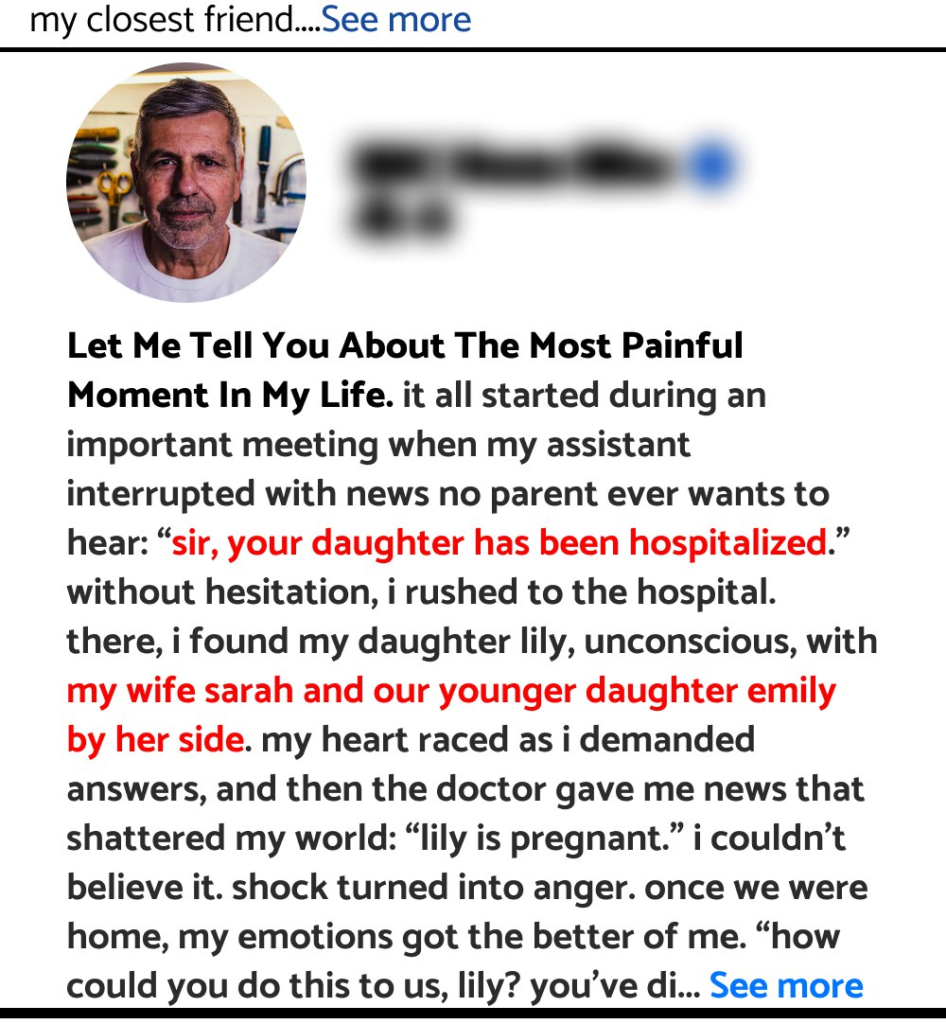 Let me tell you about the most painful moment in my life. It all started during an important meeting when my assistant interrupted with news no parent ever wants to hear: “Sir, your daughter has been hospitalized.” Without hesitation, I rushed to the hospital. There, I found my daughter Lily, unconscious, with my wife Sarah and our younger daughter Emily by her side. My heart raced as I demanded answers, and then the doctor gave me news that shattered my world: “Lily is pregnant.” I couldn’t believe it. Shock turned into anger. Once we were home, my emotions got the better of me. “How could you do this to us, Lily? You’ve disgraced this family!” I yelled, ignoring her tears and desperate attempts to explain. Blinded by my rage, I said the unthinkable—I disowned her. I was too hurt and too proud to see her pain. Days passed, the tension in our house unbearable. I refused to speak to her, convinced I was right. Then, one evening, a knock came at the door. It was a young man, Michael. He looked nervous, and the words he said next made my heart sink: “I’m responsible for Lily’s pregnancy. She didn’t do anything wrong—it’s my fault.” In that instant, I felt the weight of my mistakes. I had blamed my daughter for something she didn’t deserve. That night, I went to her room, ashamed and full of regret. “I’m so sorry,” I told her, tears filling my eyes. She looked at me, broken but willing to forgive. “I forgive you, Dad,” she whispered. In that moment, I realized that love and understanding were what our family needed most.