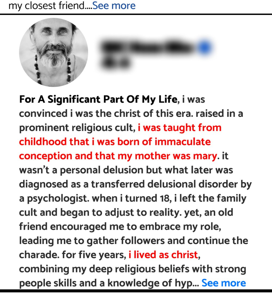 For a significant part of my life, I was convinced I was the Christ of this era. Raised in a prominent religious cult, I was taught from childhood that I was born of immaculate conception and that my mother was Mary. It wasn’t a personal delusion but what later was diagnosed as a transferred delusional disorder by a psychologist. When I turned 18, I left the family cult and began to adjust to reality. Yet, an old friend encouraged me to embrace my role, leading me to gather followers and continue the charade.