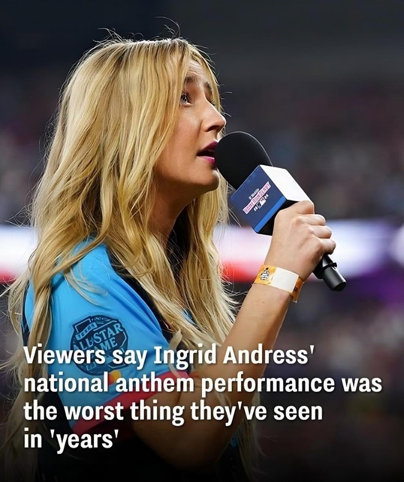 On a night when the baseball world came together to celebrate the skills of the game’s biggest sluggers, country singer Ingrid Andress delivered a rendition of the national anthem that will be remembered for all the wrong reasons.
