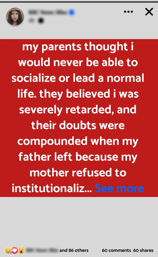 My parents thought I would never be able to socialize or lead a normal life. They believed I was severely retarded, and their doubts were compounded when my father left because my mother refused to institutionalize me. People were certain I would never learn to read or graduate from high school. Even within my family, I was often labeled as the slow one, a perpetual underachiever.