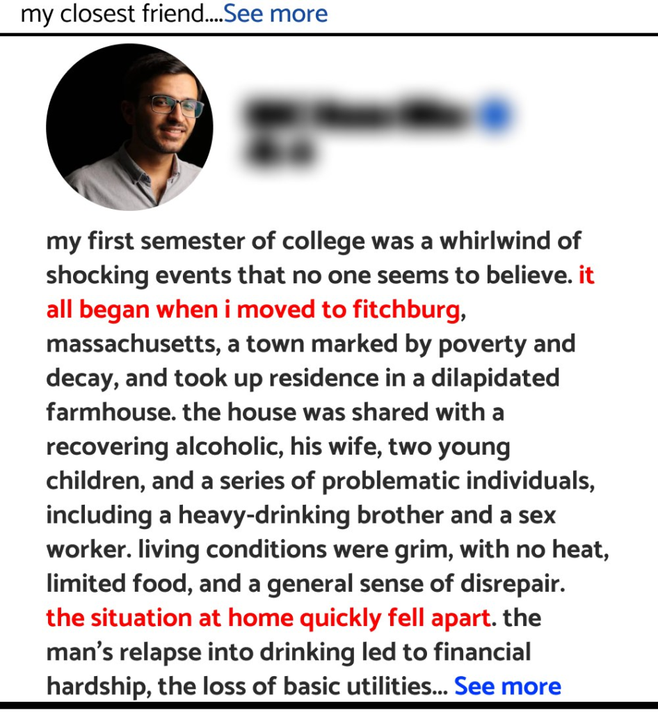 My first semester of college was a whirlwind of shocking events that no one seems to believe. It all began when I moved to Fitchburg, Massachusetts, a town marked by poverty and decay, and took up residence in a dilapidated farmhouse. The house was shared with a recovering alcoholic, his wife, two young children, and a series of problematic individuals, including a heavy-drinking brother and a sex worker. Living conditions were grim, with no heat, limited food, and a general sense of disrepair.