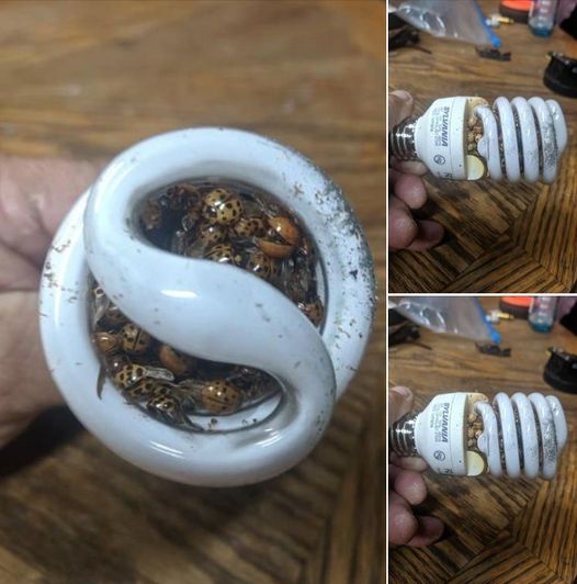 Jason shared photos of the bulb, revealing that it had become packed with ladybugs after being left in a lamp for four to five years. Apparently, the ladybugs had made themselves at home between the spirals of the bulb.