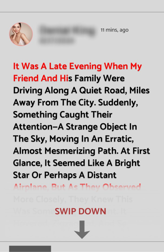 A Mysterious Encounter on the Road, SOMETIMES, WE ENCOUNTER THE UNKNOWN WHEN WE LEAST EXPECT IT. It was a late evening when my friend and his family were driving along a quiet road, miles away from the city. Suddenly, something caught their attention—a strange object in the sky, moving in an erratic, almost mesmerizing path. At first glance, it seemed like a bright star or perhaps a distant airplane….. See more