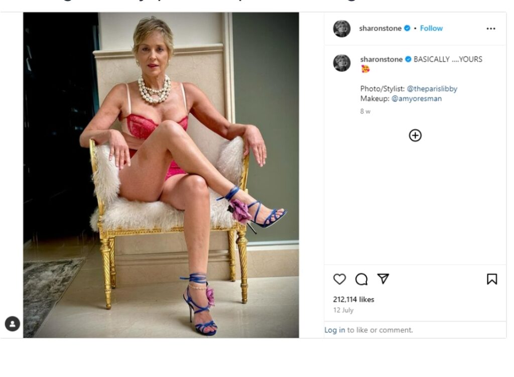 The legendary Sharon Stone reenacted a moment from the classic film “Basic Instinct” and posed while wearing only her undergarments.Sharon Stone, 66 years old, posted an Instagram photo of herself in red lace underwear—32 years after her iconic role as the alluring Catherine Tramell.She jotted down “Raw… yours” in the photo’s caption, which went viral in 12 hours, garnering over 131,000 likes. On this occasion, Michael Douglas was absent from the legendary police questioning scene.