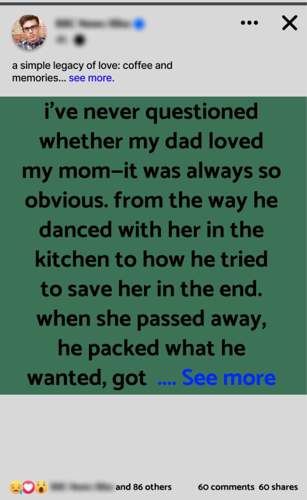 A Simple Legacy of Love: Coffee and Memories, I’ve never questioned whether my dad loved my mom—it was always so obvious. From the way he danced with her in the kitchen to how he tried to save her in the end. When she passed away, he packed what he wanted, got rid of the rest, and moved out….. See more.