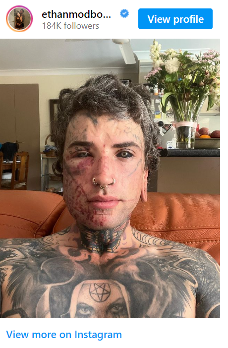 It’s his tattoos that garner the most attention, however, and that’s hardly a surprise given that he’s covered head to toe. All told, Ethan revealed that he had spent around $60,000 AUD (roughly $39,000 UD) to look the way he does.