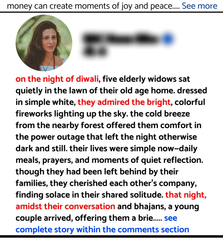 The Festival of Lights: A Night of Blessings, MONEY CAN CREATE MOMENTS OF JOY AND PEACE. On the night of Diwali, five elderly widows sat quietly in the lawn of their old age home. Dressed in simple white, they admired the bright, colorful fireworks lighting up the sky. The cold breeze from the nearby forest offered them comfort in the power outage that left the night otherwise dark and still…Continue inside the comments section