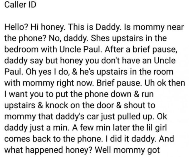 “No daddy. She is upstairs in the bedroom with Uncle Paul.” After a short pause, daddy says: “but honey, you don’t have an uncle Paul.” “Oh yes, mommy says I do and he is upstairs with mommy in the bedroom right now.”