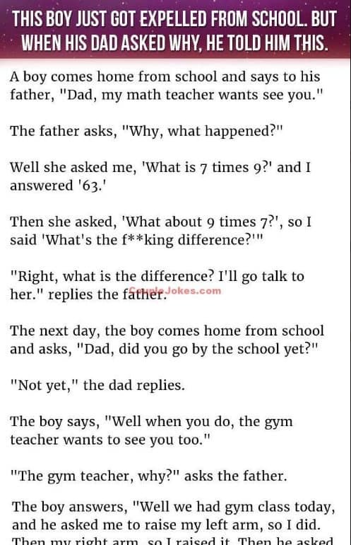 The boy explains, “In gym class, the teacher asked me to raise my left arm, then my right. Then he told me to lift my right leg, which I did. Finally, he said, ‘Lift your left leg,’ so I asked, ‘What, am I supposed to stand on my cock!?’” The father, laughing, says, “Exactly. Alright, I’ll come.”
