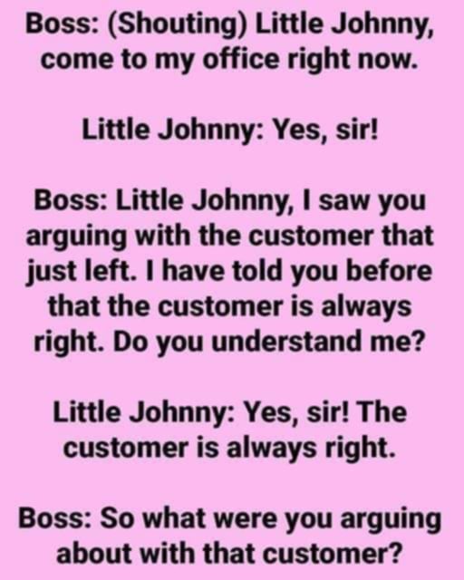 Boss: Little Johnny, I noticed you arguing with the customer who just left. I’ve told you before that the customer is always right. Do you understand?