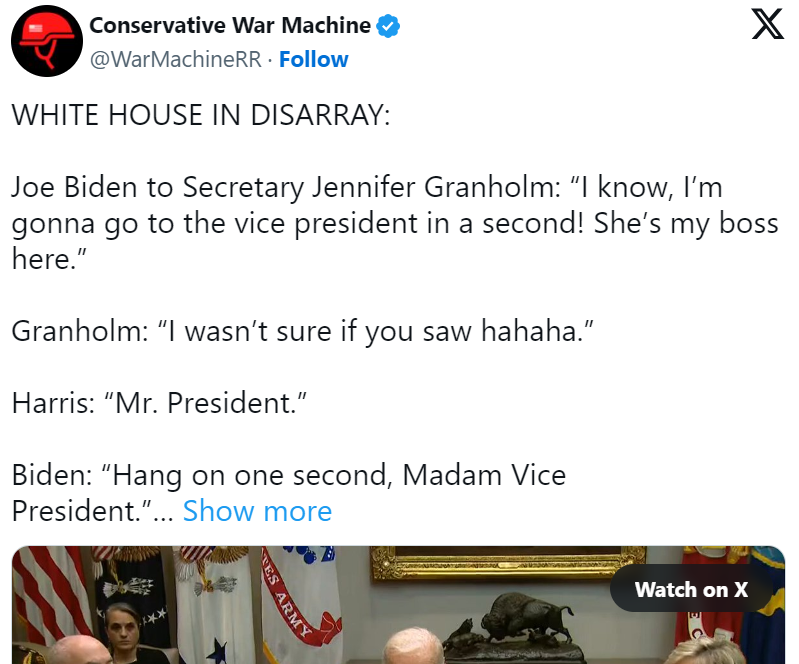 “I know,” Biden responded. “I’m going to go to the vice president in a second.” He then joked about Granholm, “She’s my boss.