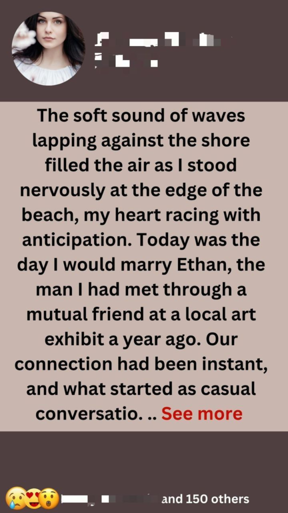 The soft sound of waves lapping against the shore filled the air as I stood nervously at the edge of the beach, my heart racing with anticipation. Today was the day I would marry Ethan, the man I had met through a mutual friend at a local art exhibit a year ago. Our connection had been instant, and what started as casual conversations about our favorite artists quickly blossomed into a deep and loving relationship.As I adjusted my veil, I took a moment to soak in the beauty around me. The sun was setting, casting a golden hue over everything, and the gentle breeze carried the scent of salt and blooming flowers. My closest friends and family gathered behind me, their smiles encouraging me to embrace this moment.Ethan stood at the altar, looking dapper in his navy suit. His warm brown eyes sparkled with love and excitement as he caught my gaze. I could see the same mixture of nerves and joy reflected in his expression. This was it—the culmination of our journey together.As I walked down the aisle, my heart swelled with happiness. Each step brought me closer to him, and I couldn’t help but remember all the moments that had led us here: our late-night talks about dreams and aspirations, spontaneous road trips to art galleries, and quiet evenings spent cooking together in my tiny kitchen.