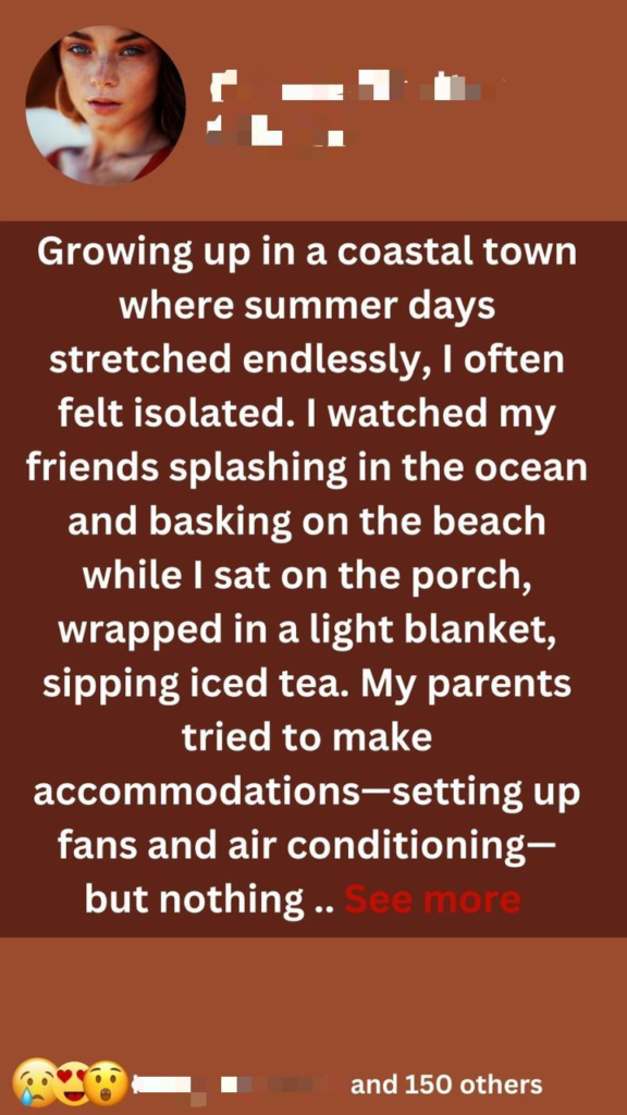 I had always been different. While other kids reveled in the summer sun, playing outside until dusk, I was stuck indoors, my skin reacting violently to the heat. It wasn’t just a mild discomfort; it was an allergy that transformed my world into a constant battle against rising temperatures. The moment the mercury climbed too high, my skin would break out in painful hives, leaving me feeling like a prisoner in my own body.Growing up in a coastal town where summer days stretched endlessly, I often felt isolated. I watched my friends splashing in the ocean and basking on the beach while I sat on the porch, wrapped in a light blanket, sipping iced tea. My parents tried to make accommodations—setting up fans and air conditioning—but nothing could replicate the freedom of being outside without fear.As I entered high school, my condition became more challenging to navigate. Social gatherings often took place outdoors, and I felt the weight of exclusion when friends invited me to pool parties or bonfires. The fear of heat kept me from joining them, and I struggled with feelings of loneliness and frustration.