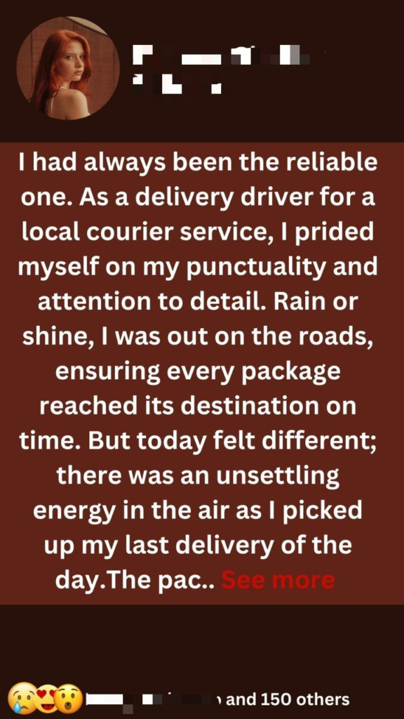 I had always been the reliable one. As a delivery driver for a local courier service, I prided myself on my punctuality and attention to detail. Rain or shine, I was out on the roads, ensuring every package reached its destination on time. But today felt different; there was an unsettling energy in the air as I picked up my last delivery of the day.The package was small but heavy, wrapped in plain brown paper with no return address. My dispatcher had given me a knowing look when handing it over, but I brushed it off, attributing it to my imagination. I loaded the package into my van and set off toward the address listed on the label—a remote cabin deep in the woods.As I drove along the winding road, the trees loomed overhead, casting eerie shadows across my path. The sun was beginning to set, and an unsettling feeling crept into my mind. What could possibly be in that package? I shook off my thoughts and focused on reaching my destination.