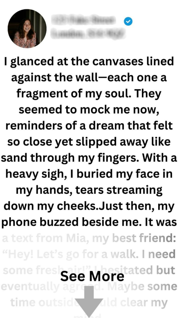 I sat on the edge of my bed, staring blankly at the wall. The morning light streamed through the window, illuminating the dust motes dancing in the air, but I felt none of its warmth. Just weeks ago, I had been brimming with excitement, preparing for my first solo art exhibition. But after receiving a crushing rejection from the gallery, all my dreams seemed to crumble around me.The email had come like a thunderclap, its words echoing in my mind: “Thank you for your submission, but we regret to inform you that your work does not align with our current vision.” Each word felt like a dagger, piercing through my confidence and leaving me feeling utterly defeated. I had poured my heart into every brushstroke, believing that this exhibition could be my big break.I glanced at the canvases lined against the wall—each one a fragment of my soul. They seemed to mock me now, reminders of a dream that felt so close yet slipped away like sand through my fingers. With a heavy sigh, I buried my face in my hands, tears streaming down my cheeks.Just then, my phone buzzed beside me. It was a text from Mia, my best friend: “Hey! Let’s go for a walk. I need some fresh air!” I hesitated but eventually agreed. Maybe some time outside would clear my mind.As we strolled through the park, Mia chatted animatedly about her own life—her job and recent adventures—but I remained withdrawn. It wasn’t until we reached a small clearing filled with blooming wildflowers that something shifted within me.