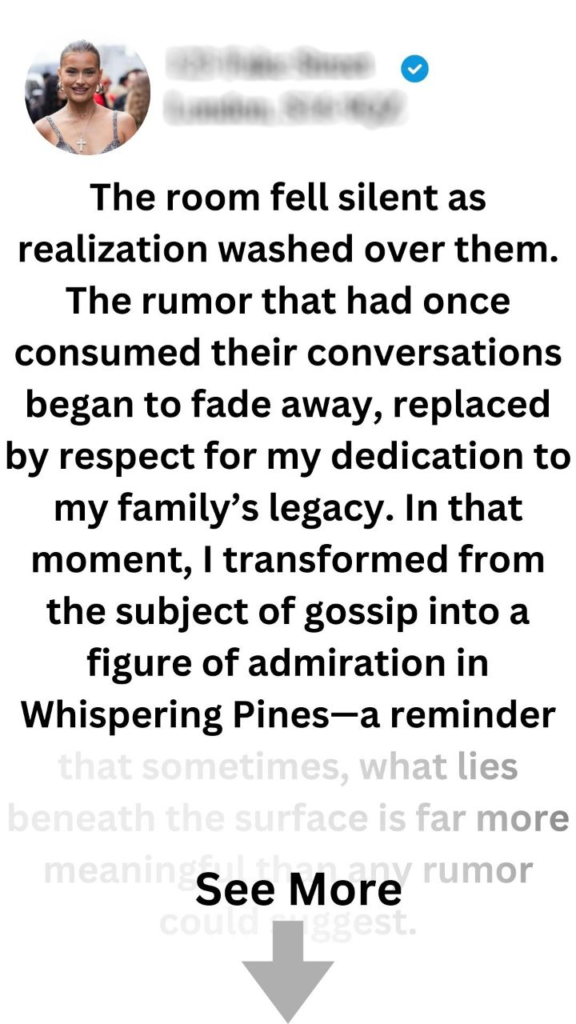 “I’m not searching for ghosts or treasure,” I said firmly. “I’m simply trying to honor my grandmother’s memory.”The room fell silent as realization washed over them. The rumor that had once consumed their conversations began to fade away, replaced by respect for my dedication to my family’s legacy. In that moment, I transformed from the subject of gossip into a figure of admiration in Whispering Pines—a reminder that sometimes, what lies beneath the surface is far more meaningful than any rumor could suggest.