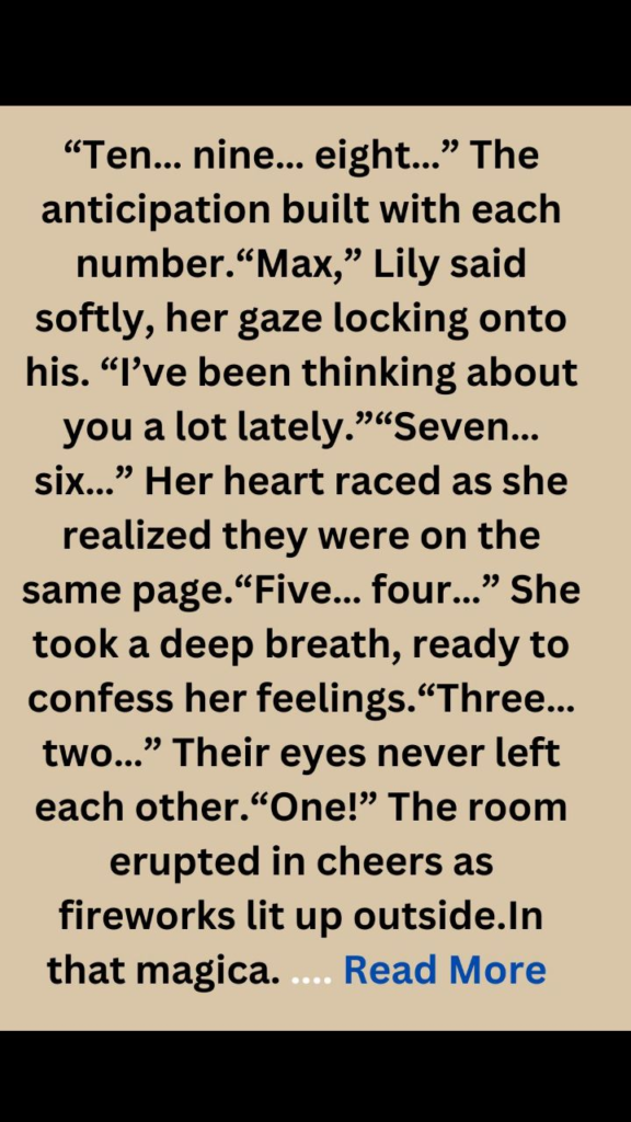 The clock in the corner of the dimly lit room ticked steadily, each second echoing in the silence that enveloped Lily and Max. They had been friends for years, sharing countless laughs and adventures, but tonight felt different. The air was charged with an unspoken tension as they prepared to ring in the New Year together.They had decided to spend the evening at Lily’s apartment, a cozy space adorned with twinkling fairy lights and a small table set for two. A bottle of champagne chilled in the fridge, waiting for the countdown. As they reminisced about the past year, laughter flowed easily between them, but beneath the surface, both felt a deeper connection stirring.“Can you believe how fast this year went by?” Lily asked, pouring two glasses of champagne. “It feels like just yesterday we were celebrating last New Year’s.”Max took a sip and smiled. “Yeah, but this year was different for us. We’ve both grown so much.”Lily nodded, her heart racing. She had been holding onto her feelings for Max for far too long, and as the minutes ticked down to midnight, she felt compelled to say something. “Max, there’s something I’ve been meaning to tell you…”Before she could finish her thought, the clock struck eleven-fifty-nine. The excitement in the room shifted as they both turned to watch the countdown on TV.“Ten… nine… eight…” The anticipation built with each number.“Max,” Lily said softly, her gaze locking onto his. “I’ve been thinking about you a lot lately.”“Seven… six…” Her heart raced as she realized they were on the same page.“Five… four…” She took a deep breath, ready to confess her feelings.“Three… two…” Their eyes never left each other.“One!” The room erupted in cheers as fireworks lit up outside.