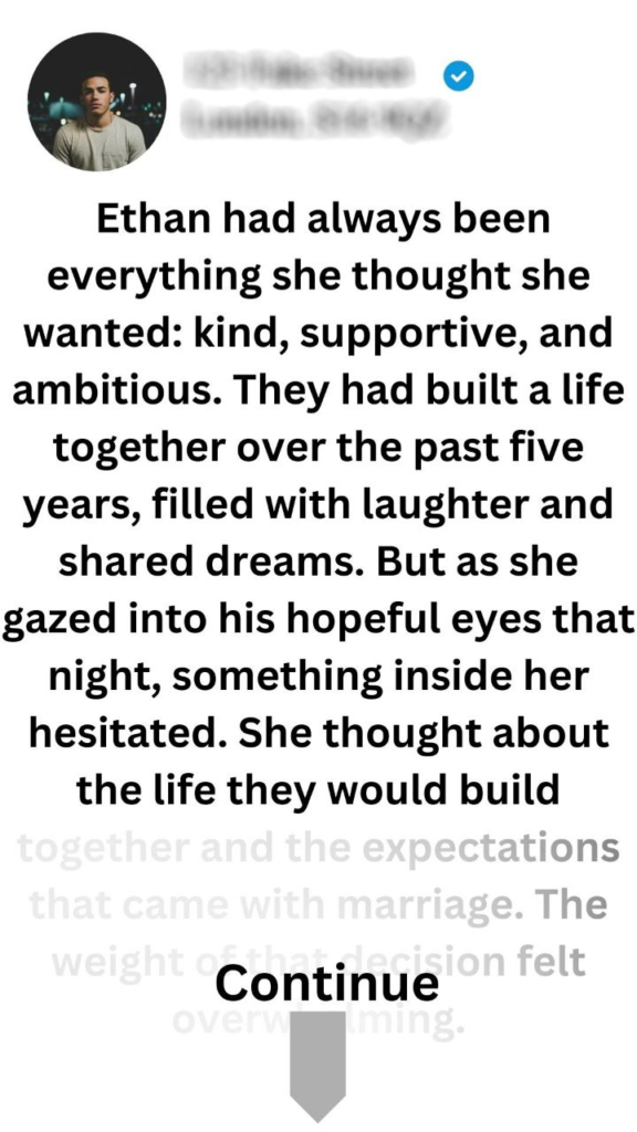 “No, it’s not you,” Lily replied, tears welling up in her eyes. “It’s me. I just don’t feel ready for this step. I need to explore who I am before committing to forever with someone else.”Ethan nodded slowly, his expression shifting from shock to understanding. They talked for hours that night, sharing their feelings and fears. In the end, they decided to take a break from their relationship to give each other space to grow.As Lily stood on the balcony now, she felt a mix of sadness and relief. She knew rejecting Ethan’s proposal was one of the hardest decisions she had ever made, but deep down, she believed it was necessary for both of them.