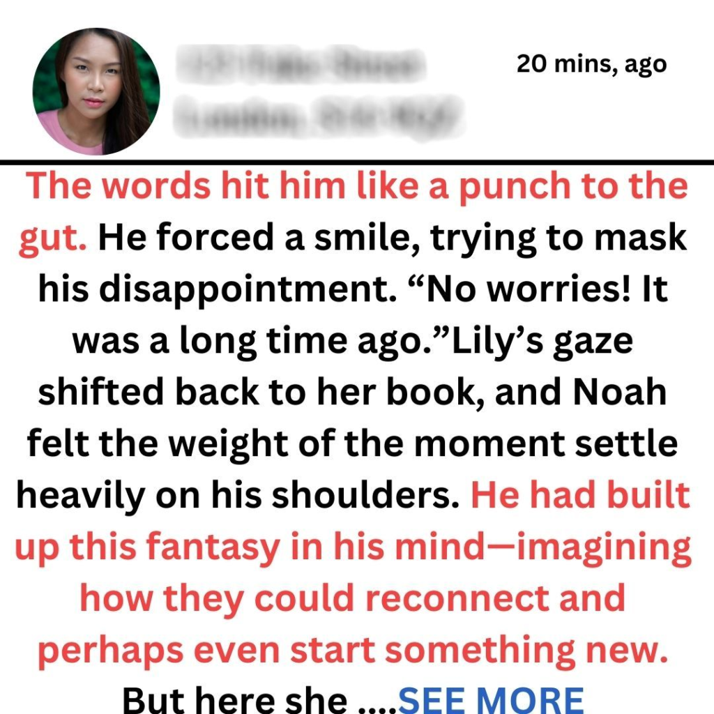 “Noah? Oh… right,” she said slowly, as if trying to place him. “I’m sorry, but I don’t really remember you.”The words hit him like a punch to the gut. He forced a smile, trying to mask his disappointment. “No worries! It was a long time ago.”Lily’s gaze shifted back to her book, and Noah felt the weight of the moment settle heavily on his shoulders. He had built up this fantasy in his mind—imagining how they could reconnect and perhaps even start something new. But here she was, a stranger in his eyes.“Would you like to grab dinner sometime?” he blurted out, hoping to salvage the situation.Lily hesitated before replying, “I’m really busy right now, but thanks for asking!”