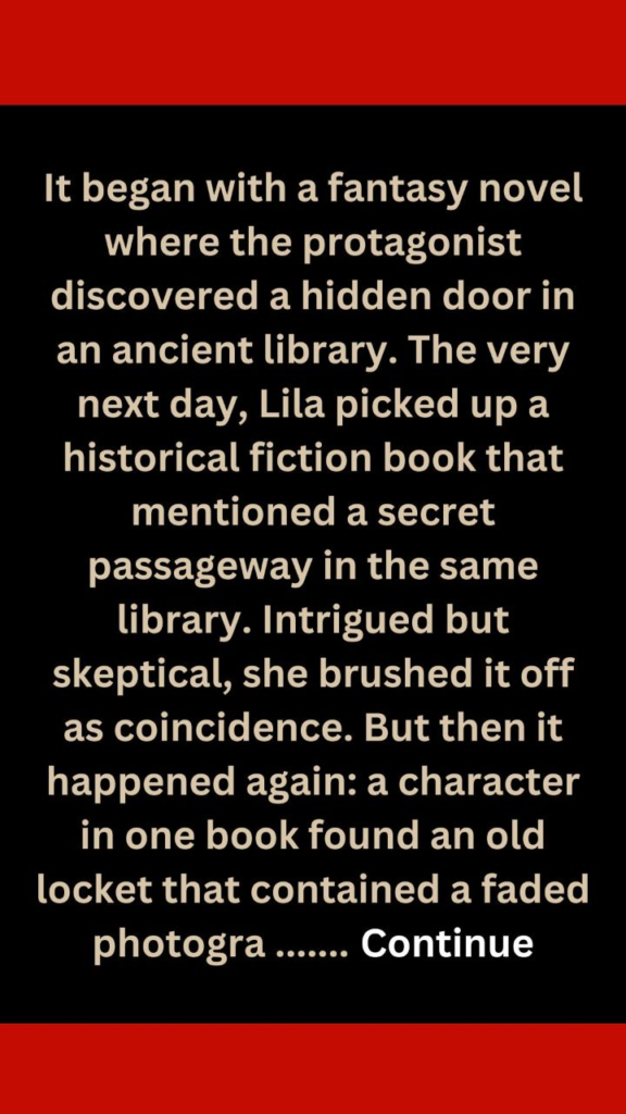 Lila had always been a voracious reader, losing herself in the pages of novels that transported her to far-off lands and different lives. Ever since she was a child, books had been her escape from the small town of Maplewood, where life felt predictable and mundane. Each week, she would visit the local library, filling her arms with books that promised adventure, romance, and mystery. However, lately, something peculiar had begun to happen. As she delved into her latest reads, she started noticing strange synchronicities—events and themes that seemed to echo from one book to another.It began with a fantasy novel where the protagonist discovered a hidden door in an ancient library. The very next day, Lila picked up a historical fiction book that mentioned a secret passageway in the same library. Intrigued but skeptical, she brushed it off as coincidence. But then it happened again: a character in one book found an old locket that contained a faded photograph, only for Lila to read about another character discovering a similar locket in a completely different story.