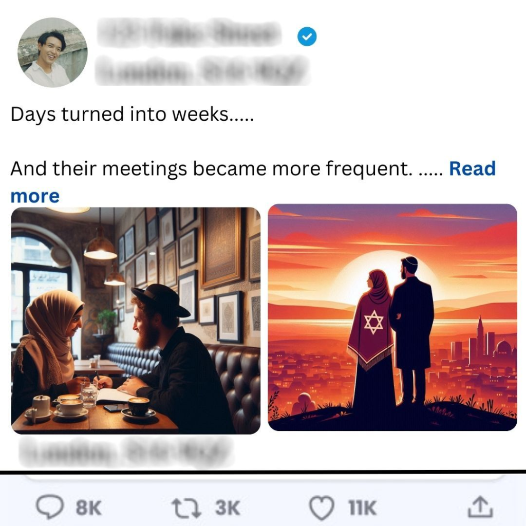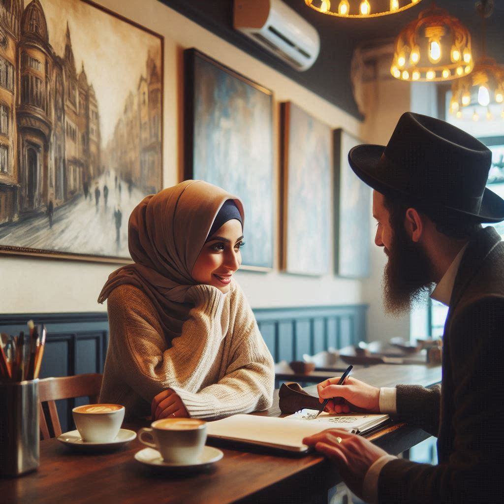In a bustling city where cultures intertwined, Amina, a devout Muslim, found herself captivated by the warm smile of Daniel, a Jewish artist who frequented the café she visited every morning. Their paths crossed often, exchanging polite nods and shy glances over steaming cups of coffee. Amina admired Daniel’s passion for his art, while he was drawn to her grace and intelligence.One rainy afternoon, as Amina sought refuge from the downpour in the café, she found herself seated next to Daniel. The conversation flowed effortlessly, from their favorite books to their dreams for the future. They discovered a shared love for art and literature, and as the rain pattered against the windows, they felt an undeniable connection blossoming between them.Days turned into weeks, and their meetings became more frequent. They explored the city together—visiting art galleries, attending cultural festivals, and sharing meals at cozy restaurants. Their laughter echoed through the streets as they learned about each other’s traditions and beliefs. However, the deeper their bond grew, the more they faced the reality of their differing backgrounds.