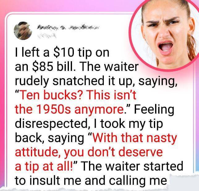 When the check arrived, Amelia left a $10 tip on an $85 bill. The waitress picked up the money and sneered, “Ten bucks? This isn’t the 1950s anymore, you know.”