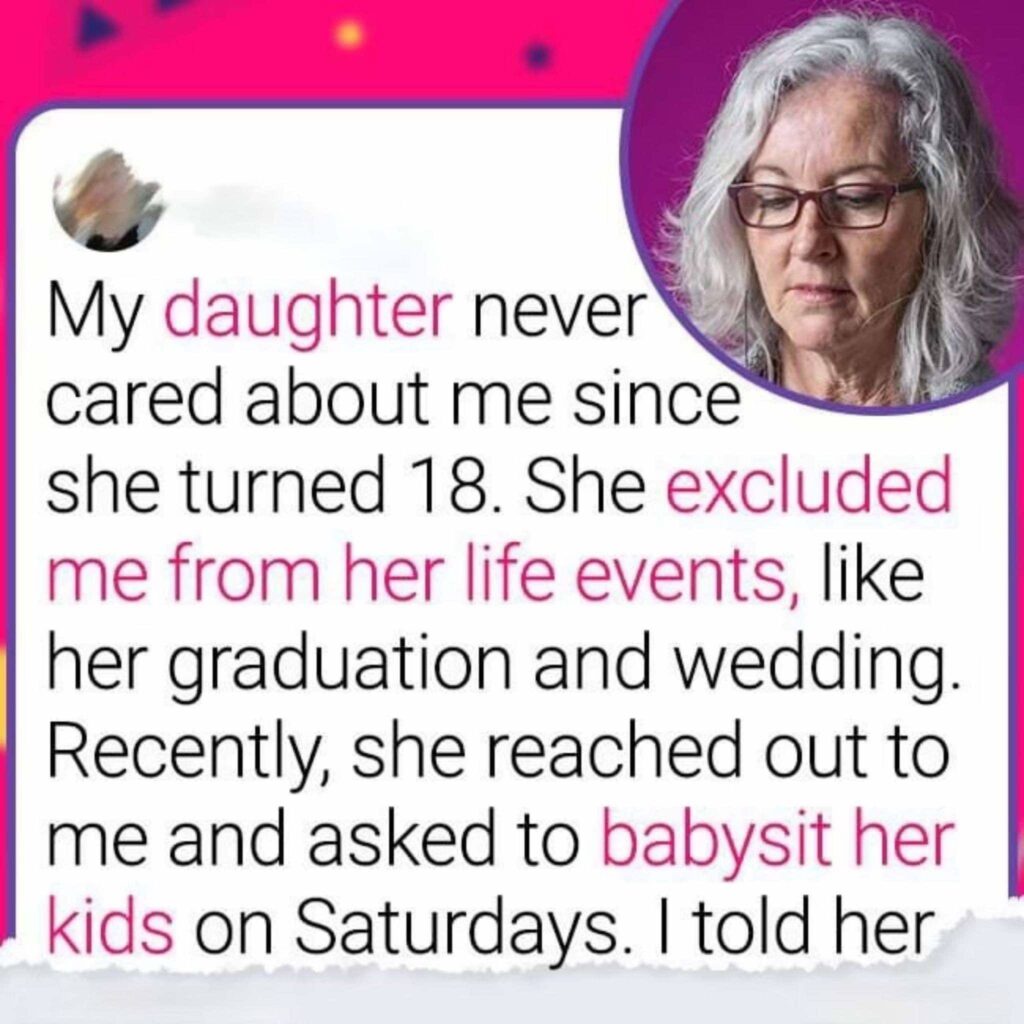 My daughter Amy never cared about me since she turned 18. She excluded me from her life events,like her graduation, her engagement, and so on. So we barely talk to each other. She has two boys now and she recently reached out to me.